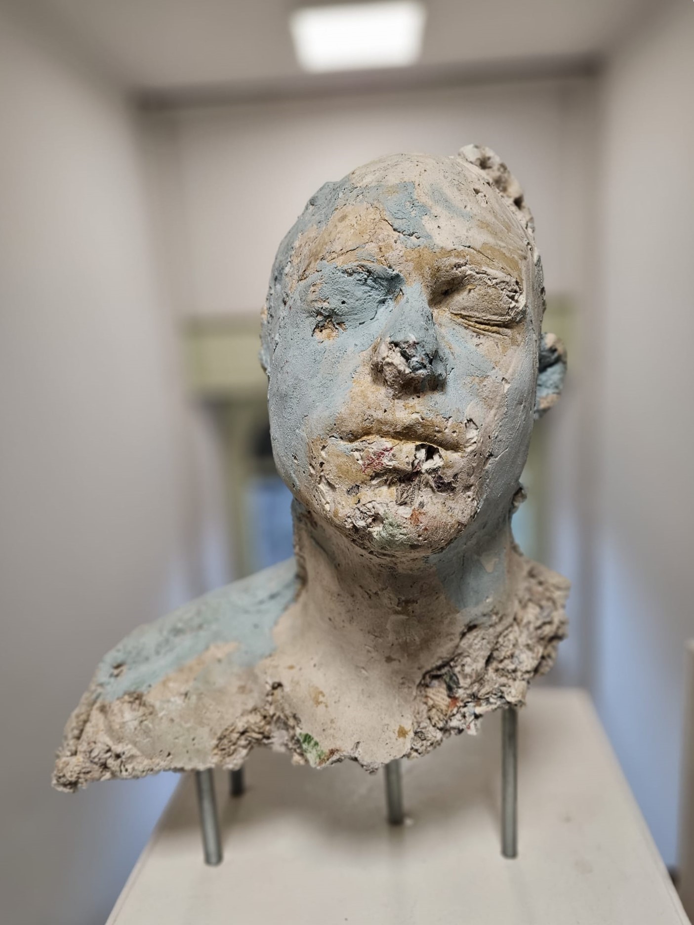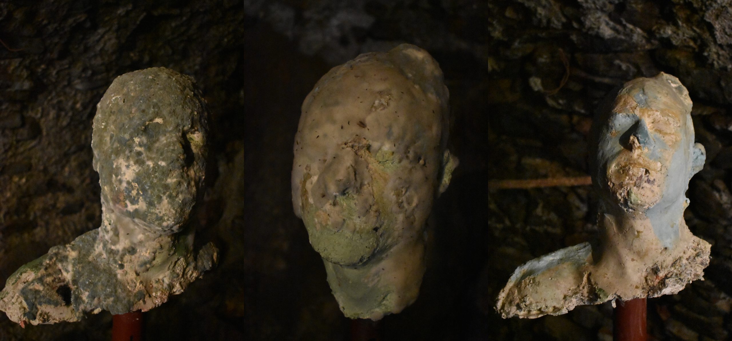 Quest’opera, in comune alla precedente (t4_4553880_1022593), è composta da un trittico di teste umane, con allusione alla Trinità, composte con materiali non nobili, quali gesso e carta di giornale, sulle quali l’artista interviene, una volta ultimate, con elementi organici (farina, colla animale, caffé) al fine di creare, grazie all’aiuto del fattore di umidità del locale espositivo, uno strato di muffe, che dona al lavoro una componente non-statica, quella del tempo, tradotta in un medium visivo, la fermentazione.